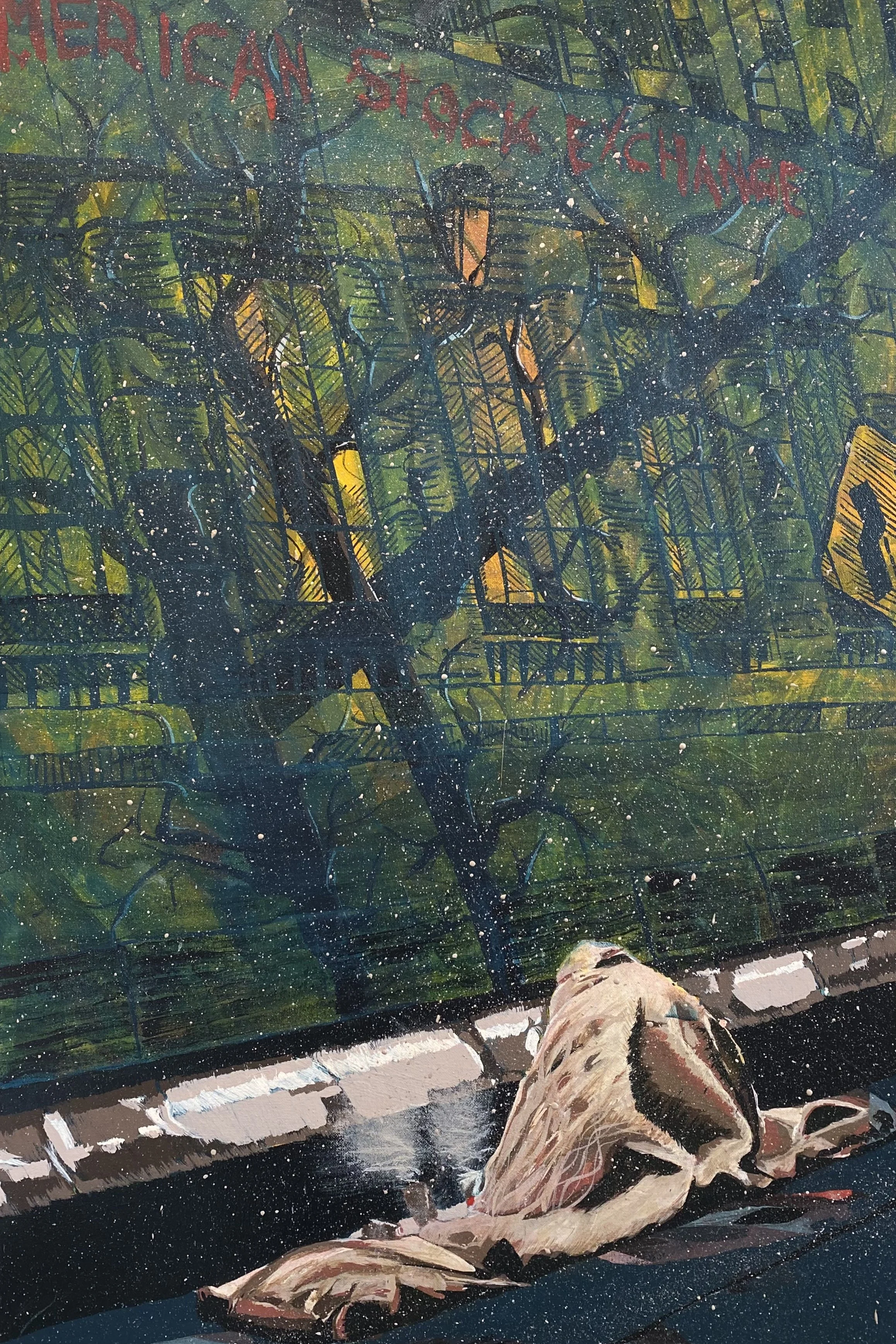 As a testament to how uncomfortable, yet necessary change can be, this painting was made for the first time using the non-dominant hand (left hand) entirely for the first time. Confronts the contradictions of American capitalism. A homeless man huddles under a blanket with instant soups at his feet, while across the street the Exchange looms in horror-red and transparent green. Behind it rises a forest of dead trees, fading yellow in the distance and black in the foreground a metaphor for institutions demanding we water what can no longer bear fruit. The work asks what survives when ambition overshadows human need.